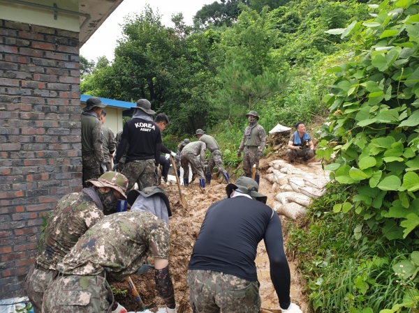 증평군 37사단 소속 장병들은 산사태로 토사 피해를 입은 도안면 주택 3곳을 대상으로 군 장병 126여명과 굴삭기 1대 등을 투입해 주택 토사 제거, 배수로 정비 등 복구작업을 실시했다.