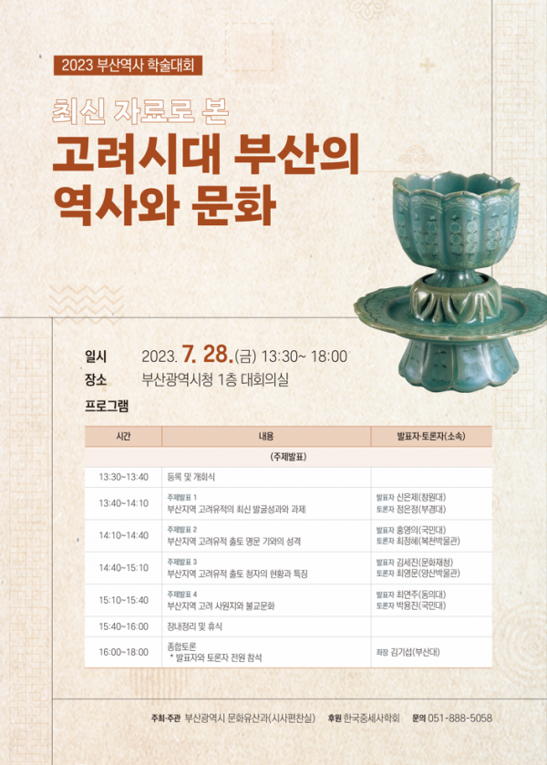 김기환 부산시 문화체육국장은 “이번 학술대회는 부산 지역에서 조사된 고려시대 유적과 유물을 통해 중세 부산지역사를 복원하기 위한 연구 활성화를 도모하고자 마련했다”며 “고려시대 부산지역민이 남긴 문화유산의 역사적 가치를 올바르게 이해할 수 있는 기회가 되기를 바란다”고 전했다.