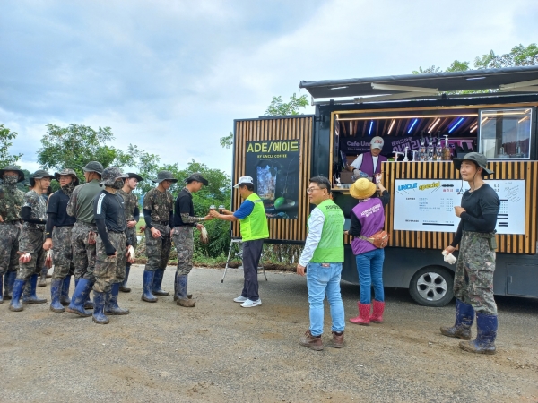 괴산시장상인회는 푸드트럭을 준비해 뜨거운 날씨에 봉사하는 봉사자들을 위한 300인분의 시원한 커피, 에이드 등을 제공했다.