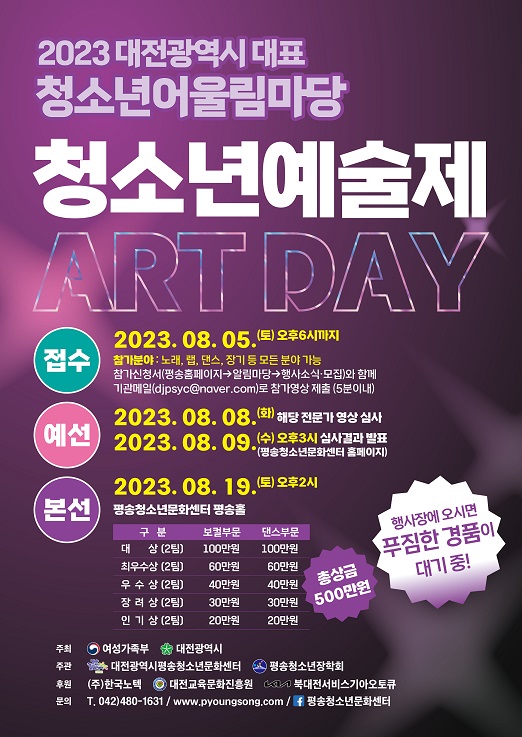 [충청뉴스큐] 대전시는 제4차 청소년어울림마당인 ‘청소년 예술제 ART DAY’를 오는 8월 19일 오후 1시에 평송청소년문화센터에서 개최한다고 밝혔다.