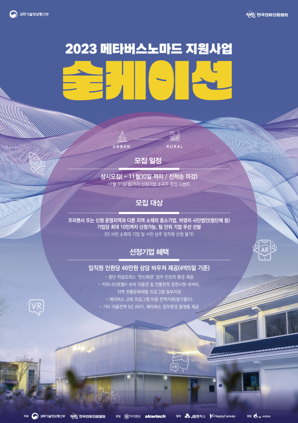 메타버스 노마드 지원사업은 메타버스 플랫폼을 활용해 시간과 장소에 구애받지 않는 원격 근무환경을 제공해 지역경제 활성화와 관계인구 증가에 기여하기 위해 추진되는 사업이다.