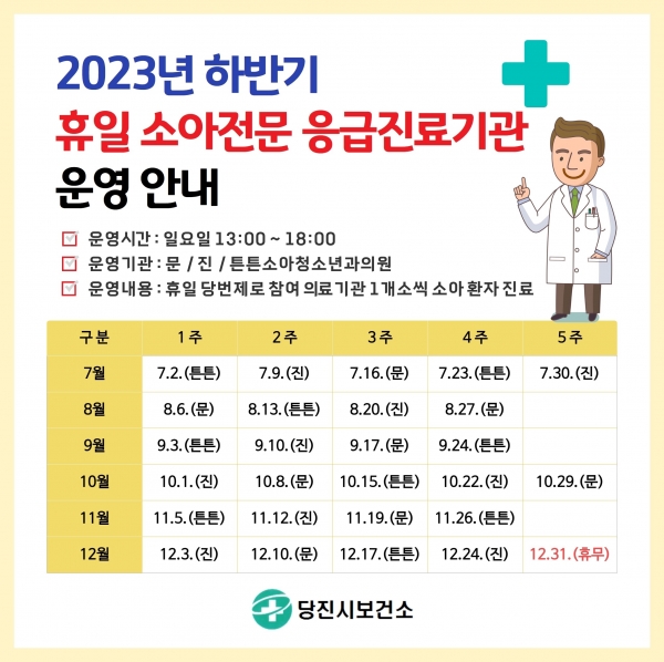 2023년 하반기에도 문소아청소년과의원, 진소아청소년과의원, 튼튼소아청소년과의원이 당번제로 1개소씩 일요일 오후 1시부터 6시까지 진료를 실시해 휴일에도 지정된 소아전문 의료기관에서 진료를 받을 수 있다.