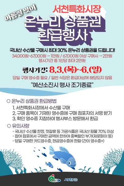 [충청뉴스큐] 서천군이 8월 3일부터 6일까지 서천특화시장에서 ‘2023년도 여름 휴가철 온누리상품권 환급행사’를 진행한다고 밝혔다.