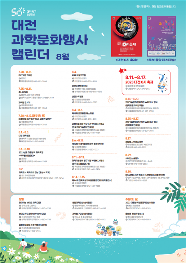 그 외에도 출연연 탐방 등 주말과 평일에도 다양한 행사가 예정되어 있으며 자세한 일정은 대전시 홈페이지‘8월 과학문화행사’코너를 통해 확인할 수 있다.