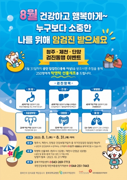 ‘2023년 충북지역암센터 8월 암검진 독려 이벤트’에 대한 자세한 내용은 충북지역암센터나 국민건강보험 대전세종충청지역본부로 문의하면 된다.