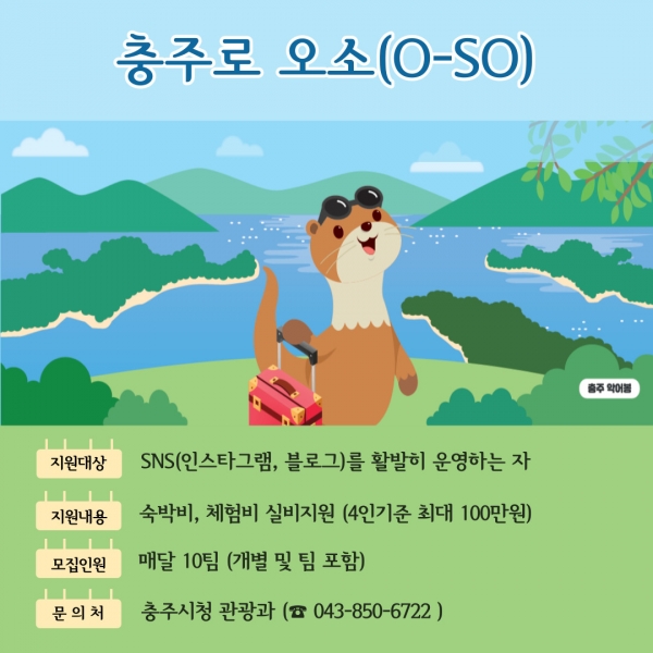 [충청뉴스큐] 충주시는 체류형 관광 프로그램인 ‘오소충주’에 참여할 참가자를 8월부터 10팀으로 확대 모집한다고 밝혔다.