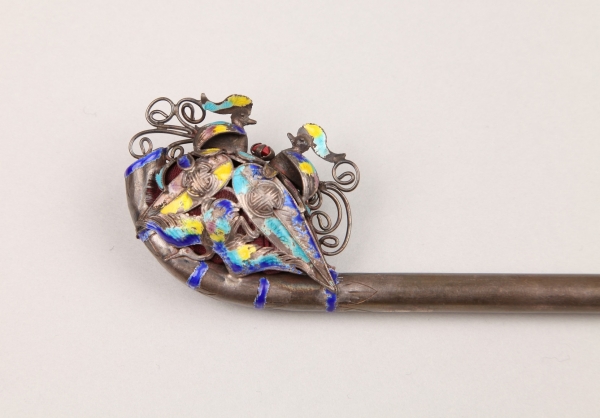 <은제 칠보 쌍조 매죽잠>은 대나무 위에 장식들이 얹힌 형태이다.