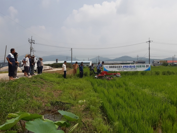 [충청뉴스큐] 논산시 농업기술센터가 지난 2일 상월면 월오리에서 친환경 벼 재배농가 및 친환경농법연구회원 20여명이 참석한 가운데 ‘외래종 잡초제거 생력화 시범사업’ 평가회를 개최했다.