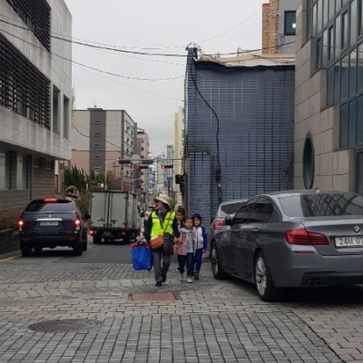 지난 11일 시작한 어린이 보행 안전 지도사업은 초등학생들의 등·하굣길에 ‘보행 안전지도사’가 함께하며 아이들을 데려다주는 것이다. 보행 안전지도사는 함께 걸으며 어린이를 보호하고, 교통안전 교육도 한다.