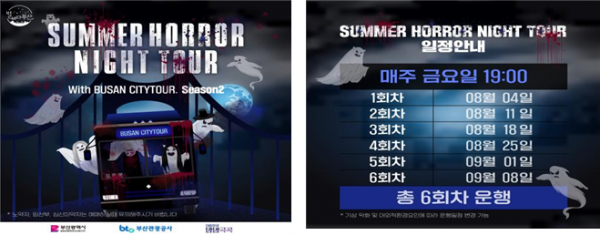 [충청뉴스큐] 무더위를 날릴 오싹한 공포 체험 버스가 부산에 뜬다 부산시는 부산관광공사와 함께 오늘부터 9월 8일까지 매주 금요일 오후 7시, 총 6회에 걸쳐 부산시티투어 야간 특별 프로그램 ‘썸머호러나이트투어’를 운영한다고 밝혔다.