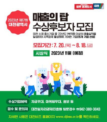 [충청뉴스큐] 대전시가 지역경제 활성화에 기여한 ‘2023년 제17회 매출의 탑 수상기업 및 유공근로자’ 선정을 위해 오는 18일까지 대상기업과 근로자를 모집한다.
