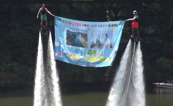 지난 3일에는 관광객에게 볼거리 제공과 옥천군 관광 홍보를 위해 금강휴게소 앞 금강변에서 ‘월드 챔피언과 함께하는 시원한 플라이보드 쇼’가 개최됐다.