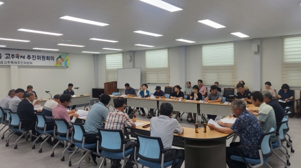 [충청뉴스큐] 충북 괴산군 괴산읍 축제추진위원회가 지난 4일 괴산읍 회의실에서 위원 20여명이 참석한 가운데 2023년 괴산고추축제의 성공개최를 위한 회의를 가졌다.
