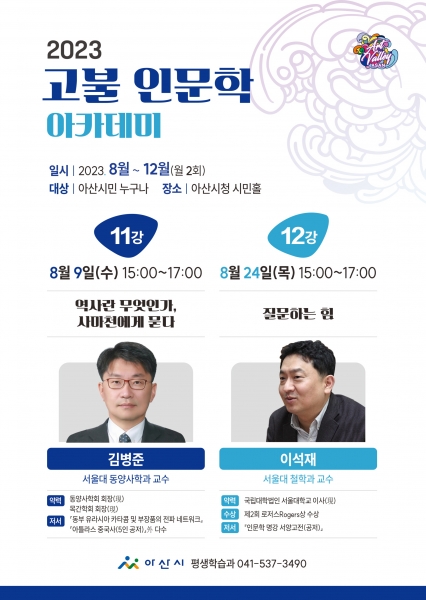 [충청뉴스큐] 아산시가 오는 9일 시청 시민홀에서 서울대 동양사학과 김병준 교수의 ‘역사란 무엇인가, 사마천에게 묻다’를 주제로 고불 인문학 아카데미 열한 번째 이야기를 이어간다.