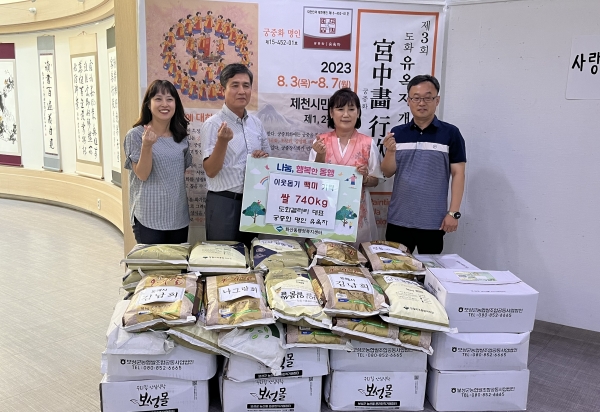 [충청뉴스큐] 대한민국 민화 부문 궁중화 명인으로 지정된 도화 민화 갤러리 유옥자 대표가 7일 화산동행정복지센터에 쌀 740kg을 기부했다, 이번 기부는 3일부터 7일까지 개최되는 제천시민회관에서 열린 유옥자 대표의 개인전 때 화환 대신 받은 쌀이며 화산동 내 저소득 취약계층에 전달될 예정이다.