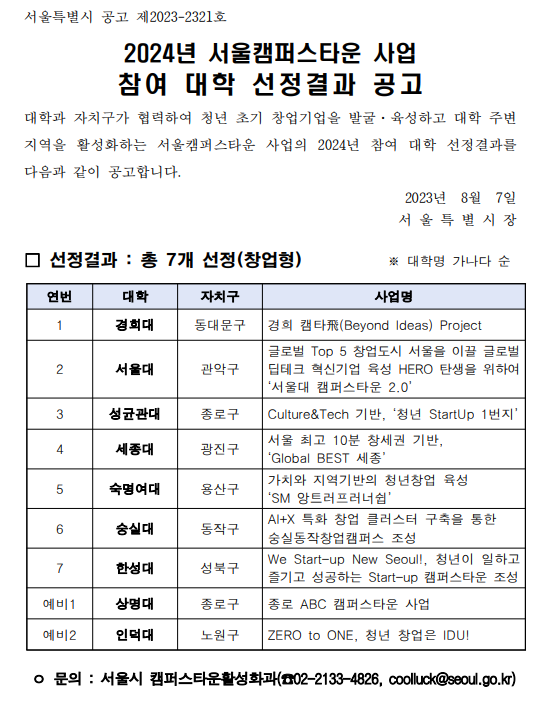 2024년 서울캠퍼스타운 사업은 대학과 자치구가 협력해 청년 초기 창업기업을 발굴·육성하고 대학 주변 지역을 활성화하고자 하는 곳을 지원하는 사업으로 서울대와 관악구는 ‘글로벌 Top 5 창업도시 서울을 이끌 글로벌 딥테크 혁신기업 육성 HERO 탄생을 위한 서울대 캠퍼스타운 2.0 사업’을 주제로 참여해 선정됐다.