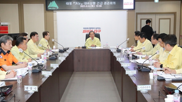 [충청뉴스큐] 대구광역시는 제6호 태풍 ‘카눈’ 북상에 따른 태풍 대비 총력 대응태세 점검을 위해 8일 오후 3시 40분, 동인청사 재난안전대책본부에서 구·군 단체장, 시 실·국장 및 유관기관장이 참여한 가운데 홍준표 대구광역시장 주재로 태풍 대비 점검회의를 개최했다.