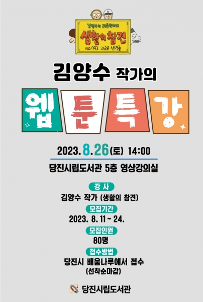 [충청뉴스큐] 당진시립도서관이 상반기 웹툰창작체험관 교육을 끝내고 하반기 교육생 모집과 웹툰창작체험관 홍보를 위해 오는 8월 26일 웹툰 특강을 개최한다.