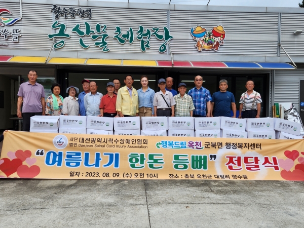 [충청뉴스큐] 사단법인 대전광역시척수장애인협회가 말복을 맞이해 지난 9일 군북면 와정리 마을회에 20kg 한돈 등뼈 50박스를 기부했다.