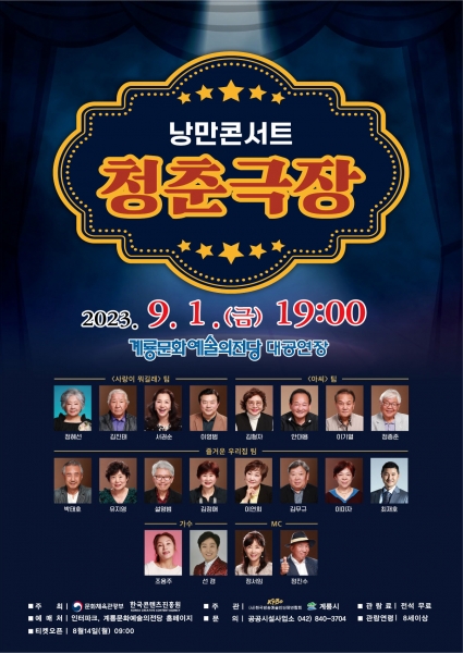 [충청뉴스큐] 계룡시가 오는 9월 1일 계룡문화예술의전당 대공연장에서 ‘낭만콘서트 청춘극장’을 개최한다고 밝혔다.