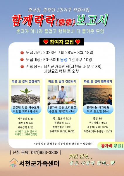 [충청뉴스큐] 서천군가족센터가 1인 가구의 삶의 질 향상과 사회적 관계망 형성을 지원하고자 오는 18일까지 충남형 1인가구 지원사업 ‘함께락락보고서’ 신청자를 모집한다.