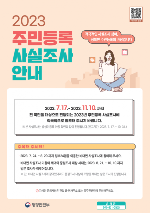 [충청뉴스큐] 음성군은 전 군민을 대상으로 오는 11월 10일까지 ‘2023년 주민등록 사실조사’를 실시한다.
