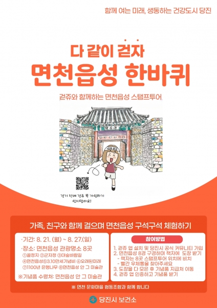 [충청뉴스큐] 당진시보건소가 오는 8월 21일부터 27일까지 면천면에서 ‘다 같이 걷자 면천읍성 한 바퀴’스탬프 투어 걷기 행사를 개최한다.