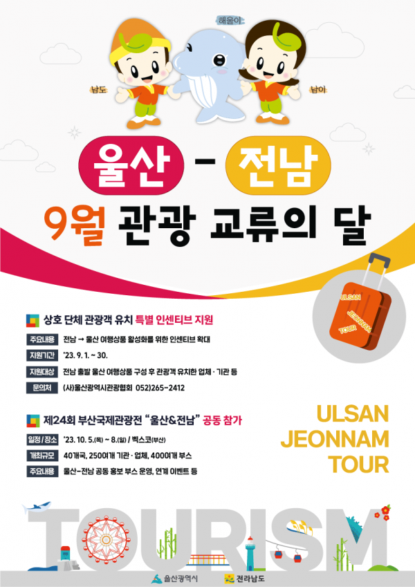 이밖에 10월 5일부터 8일까지 부산 벡스코에서 열리는 제24회 부산국제관광전에 참가해 ‘울산-전남 공동홍보관’을 운영한다.