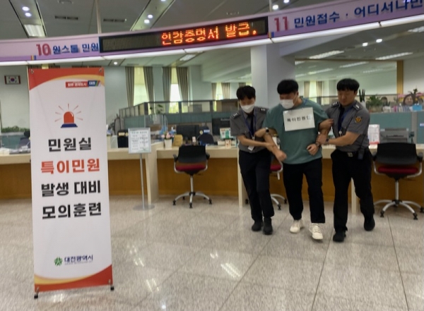 [충청뉴스큐] 대전시는 17일 대전시청 소통민원실에서 둔산경찰서와 합동으로 ‘하반기 특이민원 발생 대비 경찰합동 모의훈련’을 실시했다 이번 모의훈련은 폭언·폭행 등 민원응대 과정에서 발생할 수 있는 비상 상황으로부터 방문 민원인과 민원 담당 공무원을 보호하고 피해를 예방할 수 있는 현장 대응능력을 향상하기 위해 마련됐다.