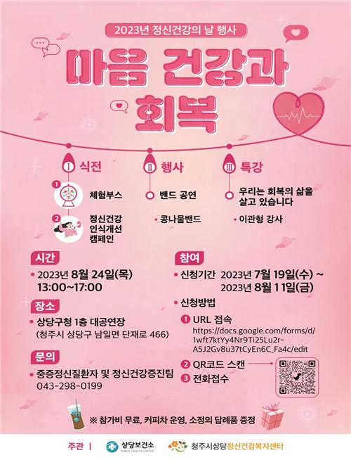 [충청뉴스큐] 청주시 상당보건소와 상당정신건강복지센터는 오는 24일 상당구청 대공연장에서 2023년 정신건강의 날 기념행사를 개최한다고 밝혔다.