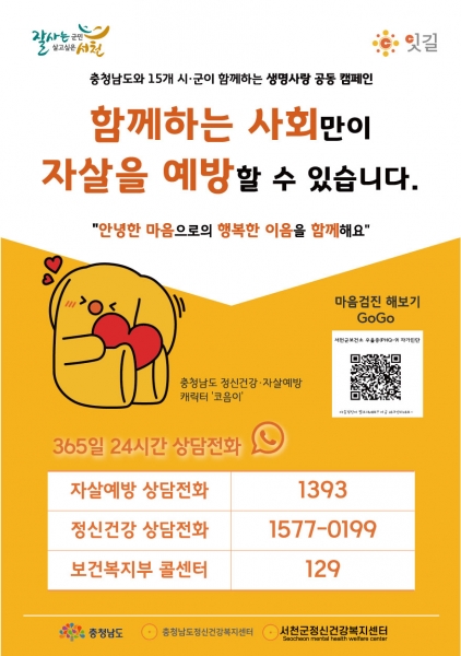 한편 서천군보건소는 자살 유족 자조모임 외에도 자살 고위험군 등록관리, 자살 시도자 치료비 지원, 고령층 및 고위험군 발굴을 위한 생명사랑 행복마을 운영 등 자살예방 안전망 구축을 위해 힘쓰고 있다.