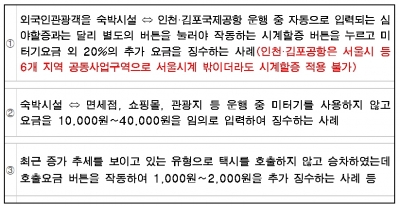 한편 작년 한해 외국인 대상 위법행위로 적발된 310건 중 부당요금징수는 301건으로 97%를 차지했다. 부당요금징수 수법으로는 외국인이 판가름하기 어려운 시계할증이 가장 많았다.