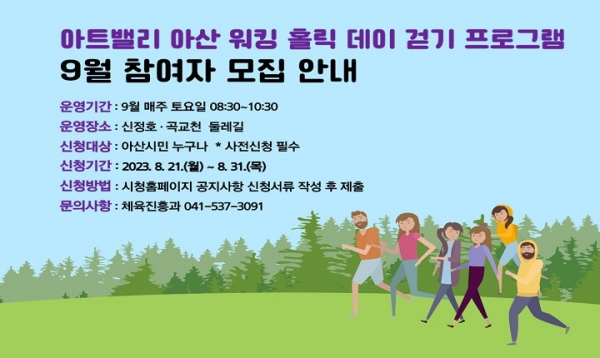 [충청뉴스큐] 아산시가 ‘아트밸리 아산 워킹 홀릭 데이’ 걷기 프로그램 9월 참여자를 모집한다.