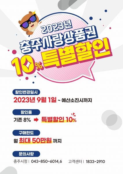[충청뉴스큐] 충주시는 9월 1일 0시부터 충주사랑상품권 할인율을 8%에서 10%로 인상하고 월 구매한도는 50만원으로 유지한다고 밝혔다.