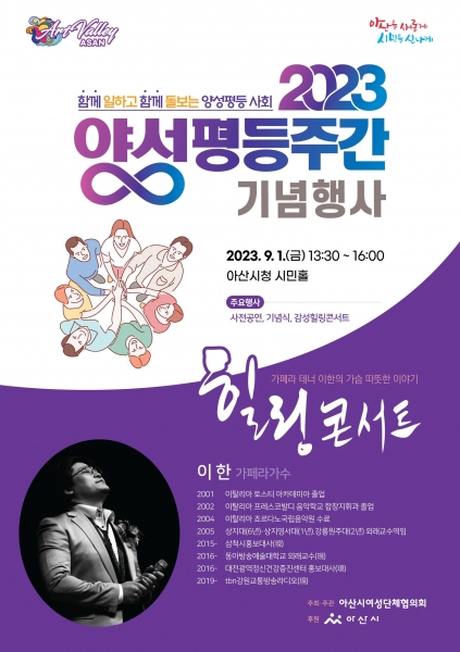 [충청뉴스큐] 아산시가 오는 9월 1일 시청 시민홀에서 ‘2023년 양성평등주간 기념행사’를 개최한다.
