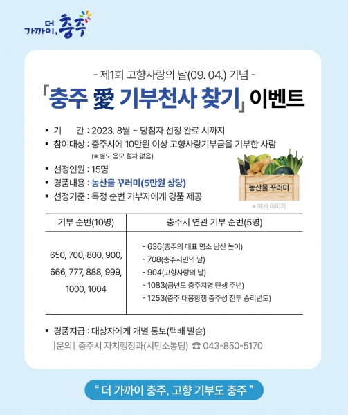 [충청뉴스큐] 충주시는 ‘제1회 고향사랑의날’을 기념하고 건전한 기부문화 확산을 위해 ‘충주愛 기부천사 찾기’ 이벤트를 추진한다고 23일 밝혔다.