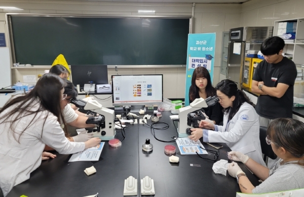 1단계로 2021년 업무협약 이후 지속적인 교류를 이어오고 있는 중원대학교 임상병리학과 이형선 교수의 1:1 대학입시컨설팅, 중원대학교 학과소개, 혈액형 검사, 쥐 해부실습이 진행됐다.