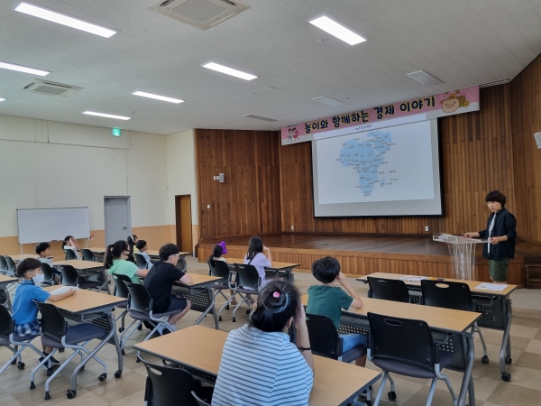 초등학생을 대상으로 한 여름 독서교실은 15명의 학생들이 ‘놀이와 함께하는 경제 이야기’를 주제로 관련 그림책 읽기, 논술, 보드게임 등을 즐겼다.