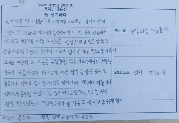 또 한희자 어르신의 ‘사랑하는 아들들아’ 엽서 작품이 글꽃상 수상작품으로 선정됐다.