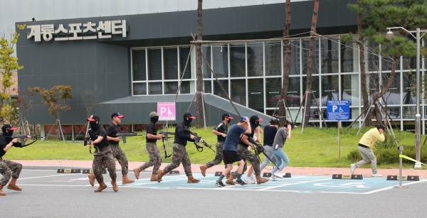 이날 훈련 참가자들은 계룡스포츠센터 테러 및 화재발생등 혼란스러운 상황에서 유관기관 간 긴밀한 협조체계를 구축, 구급차와 소방차 등의 장비를 동원해 화재진압, 인명구조, 테러범 검거, 폭발물 제거 등 신속한 테러진압 과정을 수행했다.