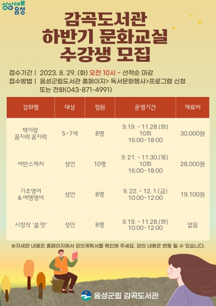 맹동혁신도서관에서는 문화교실 강좌로 ‘독서대장 글쟁이 그림책’, ‘인문학으로 큐레이션하다’ 등 7강좌를 운영하고 대소도서관에서는 ‘마음이음 푸드테라피’ 등 6강좌 삼성도서관에서는 ‘가을 수채화 연필 풍경 스케치’ 등 3강좌를 운영하며 감곡도서관에서는 ‘시 창작 쓸 맛’ 등 4강좌를 운영한다.