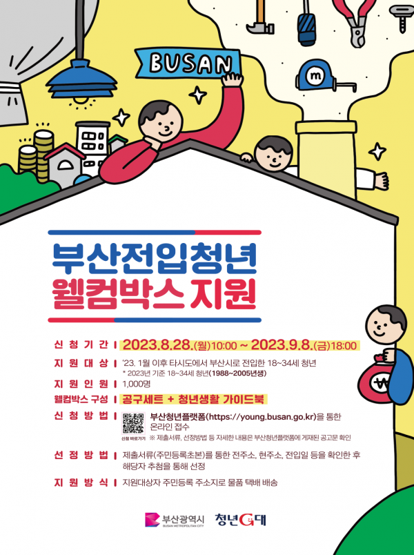 청년들에게 제공되는 ‘웰컴박스’는 주거 생활에 필요한 ‘공구 세트’와 부산 청년들이 신청해 지원받을 수 있는 다양한 주거지원 사업을 소개한 ‘청년생활 가이드북’으로 구성돼 있다.