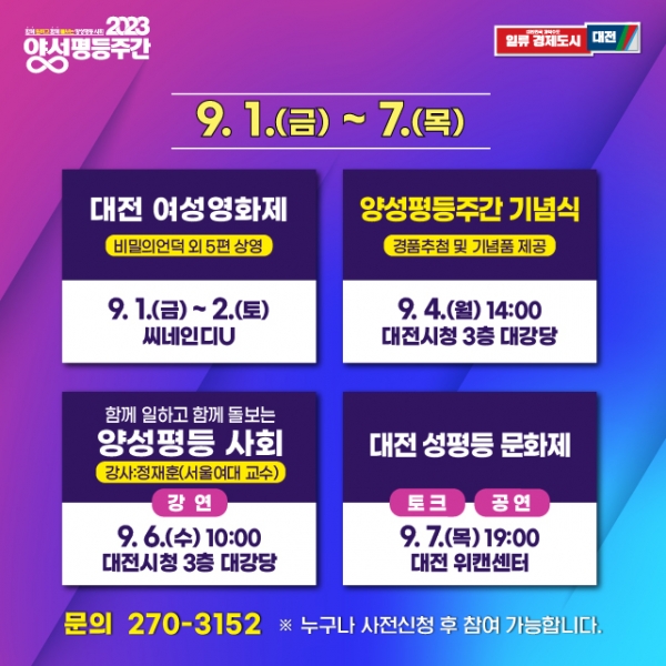 [충청뉴스큐] 대전시가 오는 9월 1일부터 7일까지 2023년 양성평등주간을 맞아‘함께 일하고 함께 돌보는 양성평등 돌봄’을 주제로 다양한 양성평등 문화 확산 행사를 개최한다.