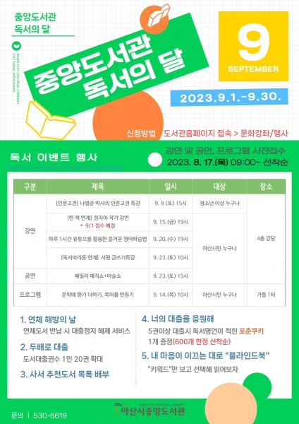 또한 9월 한 달 동안 자료실에서 도서 대출 확대, 대출 정지 면제, 사서 추천 도서 목록 배부 등의 독서이벤트도 함께 진행된다.