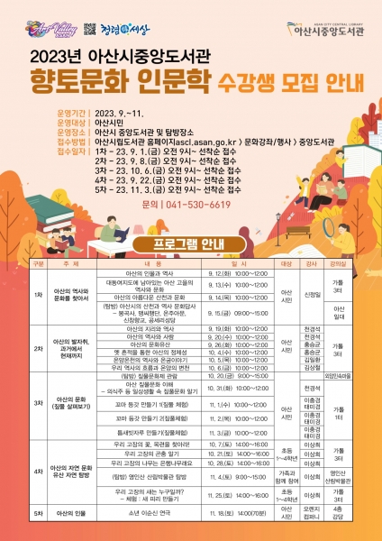 [충청뉴스큐] 아산시 중앙도서관이 ‘향토 문화 인문학프로그램’을 9월 12일부터 11월 25일까지 운영한다.