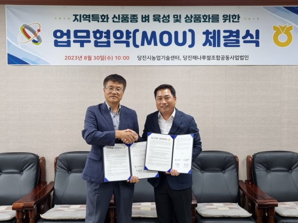 [충청뉴스큐] 당진시농업기술센터가 당진해나루쌀조합공동사업법인과 농업기술센터에서 30일 지역특화 신품종 벼 육성과 상품화를 위한 업무협약을 체결했다.