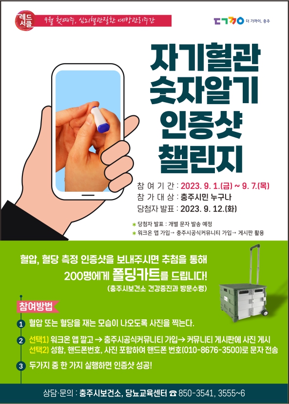 [충청뉴스큐] 충주시는 심뇌혈관질환 예방관리주간을 맞아 9월 한 달 동안‘자기 혈관 숫자 알기’라는 슬로건을 걸고 레드서클 캠페인을 실시한다고 밝혔다.