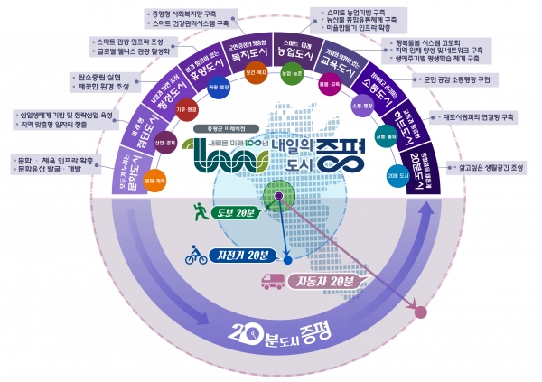 10대 정책목표 중 하나인 20분 도시 증평은 친환경 생활공간을 기반으로 군민이 언제, 어디서나 보건·복지, 문화·체육, 교육·돌봄 등 다양한 혜택을 누릴 수 있도록 인프라를 구축하고 생활 서비스를 제공한다는 방침이다.