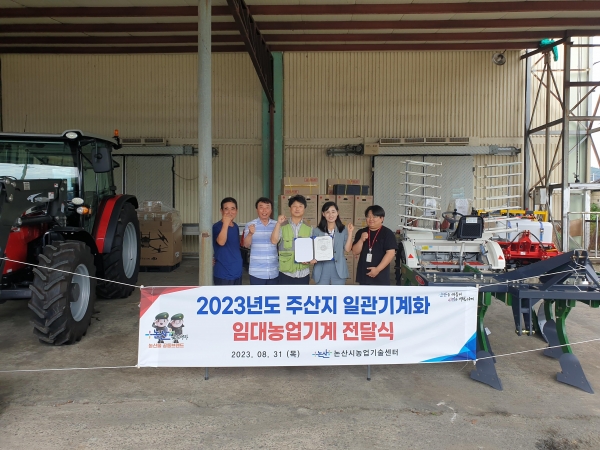 [충청뉴스큐] 논산시 농업기술센터가 논 작물에 비해 기계화율이 낮은 밭작물 농사를 뒷받침하기 위해 양촌면 소재 양촌윤가농원 윤권중 대표에게 장기 임대용 농업기계를 전달했다.