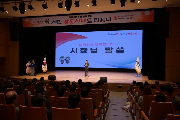 [충청뉴스큐] 논산시가 1일 오전 논산아트센터 대공연장에서 400여 시민이 모인 가운데 9월 월례모임을 개최했다.